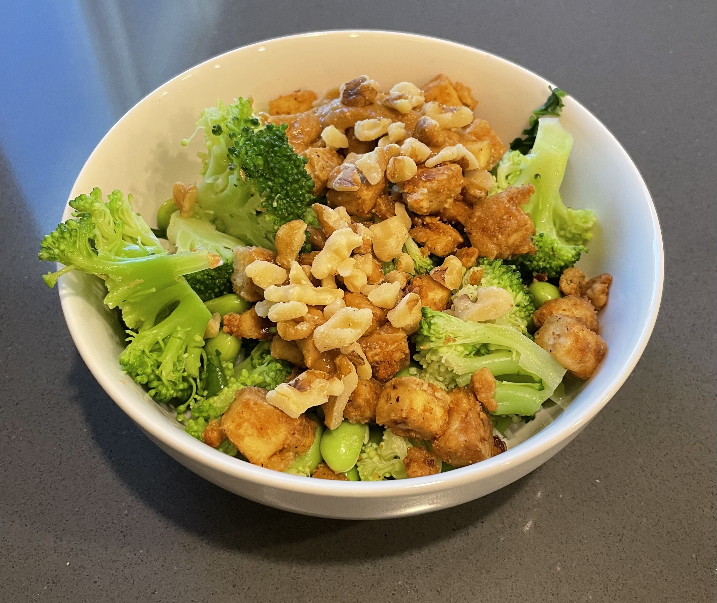 - Assemble. Squeeze a bit of lime juice on top of the warm baked peanut tofu. Divide cooked rice between four bowls. Top with broccolini & edamame, then drizzle some Peanut Sauce on top of each. Top with baked peanut tofu, cilantro, and chopped nuts. Spoon more Peanut Sauce on top.